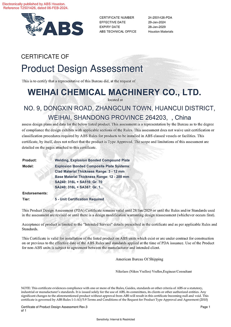 近日,威海化機順利獲得美國船級社(ABS)頒發的產品設計PDA認可證書,認可產品名稱為“爆炸焊接復合板”,涵蓋產品種類:ASME SA264、ASME SA265、ASTM B898標準…