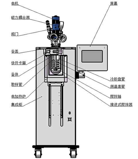 產(chǎn)品功能和特點(diǎn):升降型式,機(jī)電一體化設(shè)計、結(jié)構(gòu)緊湊;框架支撐結(jié)構(gòu),配腳輪方便移動;主體可快開設(shè)計,開閉釜操作方便、快捷;升降輔助機(jī)構(gòu)方便操作,手動/電動可選;高扭矩磁力傳動,配優(yōu)選電機(jī),提升運(yùn)行穩(wěn)定性;攪拌支持定制槳葉類型,適配多樣化攪拌需求;加熱爐傳熱快,均熱效果好,效率可調(diào);真彩色觸控屏,模塊化顯示,控制界面操作簡潔;支持遠(yuǎn)程控制,具備RS485通訊口,配上位機(jī)軟件;可顯示工作時間/溫度/轉(zhuǎn)速/壓力,PID自整定控溫精準(zhǔn);具備安全連鎖功能,超溫超壓報警;具備數(shù)據(jù)采集,記錄以及報表導(dǎo)出功能;支持選配加料、計量、取樣、冷凝等擴(kuò)展功能。